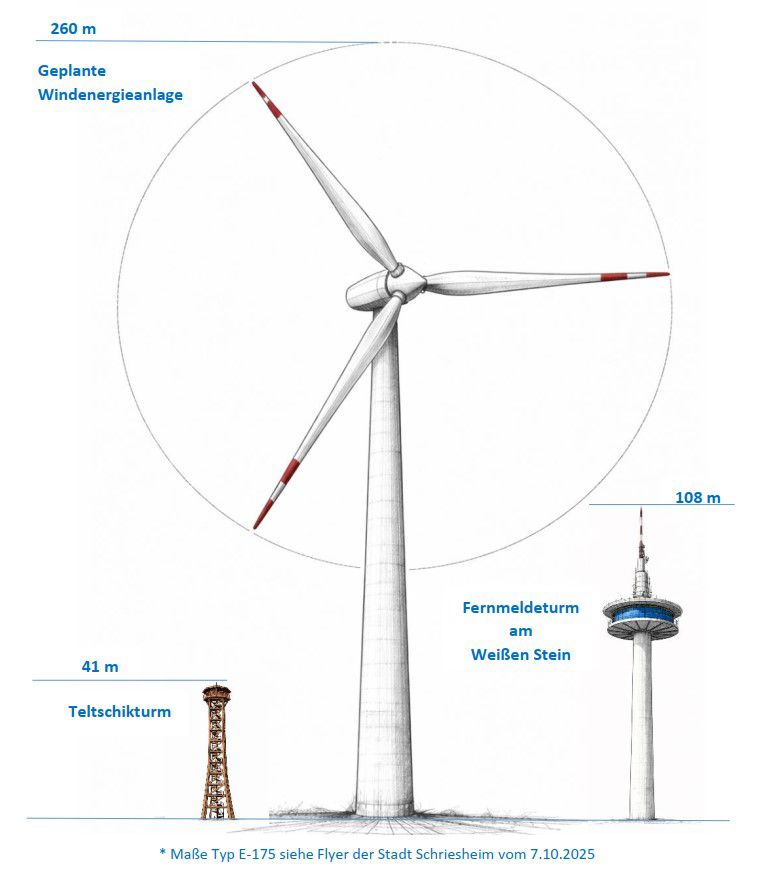 Die geplanten Windenergieanlagen erreichen eine Gesamthöhe von mehreren hundert Metern (Nabenhöhe zuzüglich Rotordurchmesser). Der beigefügte Größenvergleich verdeutlicht die tatsächlichen Dimensionen im Verhältnis zum Teltschikturm und dem Fernmeldeturm am Weißen Stein.
